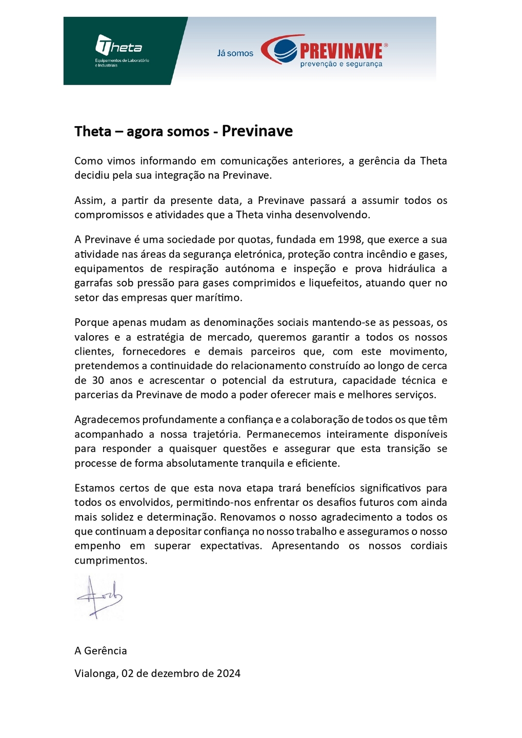 Assim, a partir da presente data, a Previnave passará a assumir todos os compromissos e atividades que a Theta vinha desenvolvendo.