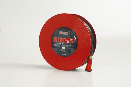 Carretel de parede basculante, com lanço de mangueira de 20m ou 25m e diâmetro de 25mm, incluindo agulheta de 3 posições e válvula macho esférico 1”